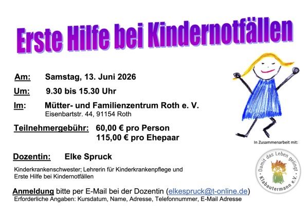 Nach den erfolgreichen Kursen im Dezember 2024 und März 2025 möchte Frau Spruck in unseren Räumen wieder einen 1. Hilfe Kurs für Kindernotfälle anbiteen. Frau Spruck ist Kinderkrankenschwester und Lehrerin für 1. Hilfe- Kurse. Sie hat jahrelange Erfahrung als Dozentin und weiß wovon sie redet.