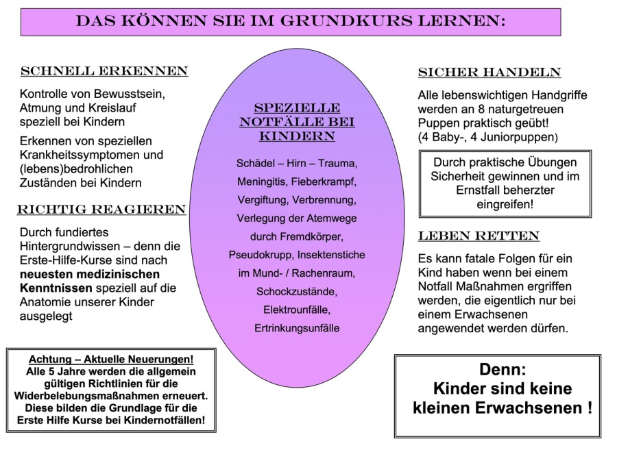 Der Kurs ist für alle Eltern, Großeltern oder sonstige Familien-mitglieder geeignet, die sich fit machen wollen für den Notfall. Wir wünschen uns alle, dass unseren kleinen Schätzen nie etwas zustoßen wird. Sollte das jedoch trotz aller Vorsicht passieren, dann wisst ihr was ihr tun müsst und könnt im Notfall schnell helfen. Also, meldet euch an und bekommt Sicherheit und Fachwissen mit auf den Weg!