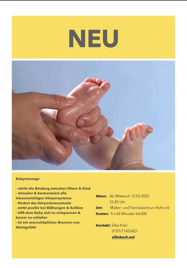 Ab Mittwoch, den 12.03.2025 jeweils um 10.45 Uhr (5 Termine) findet der Kurs Babymassage DGBM statt.